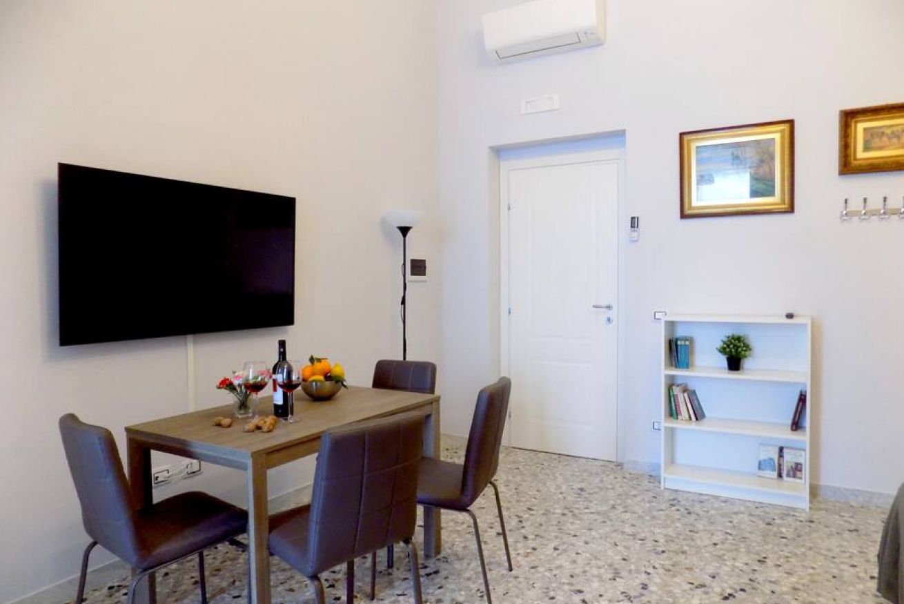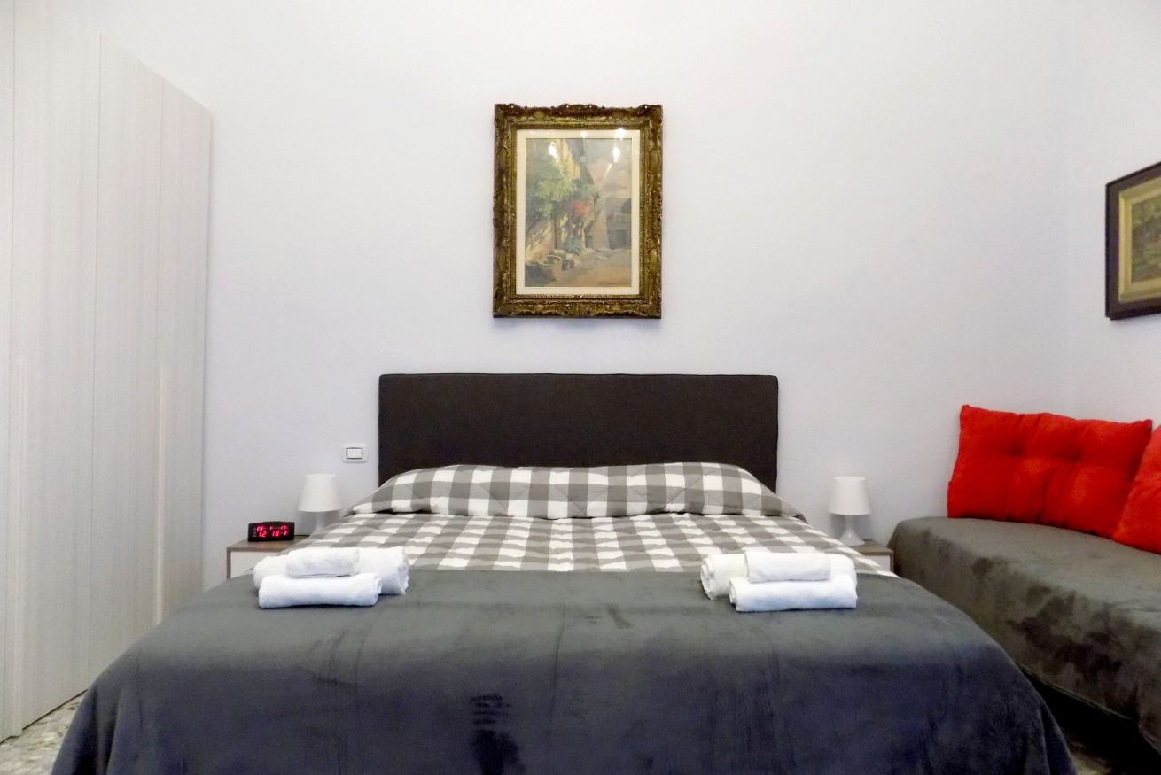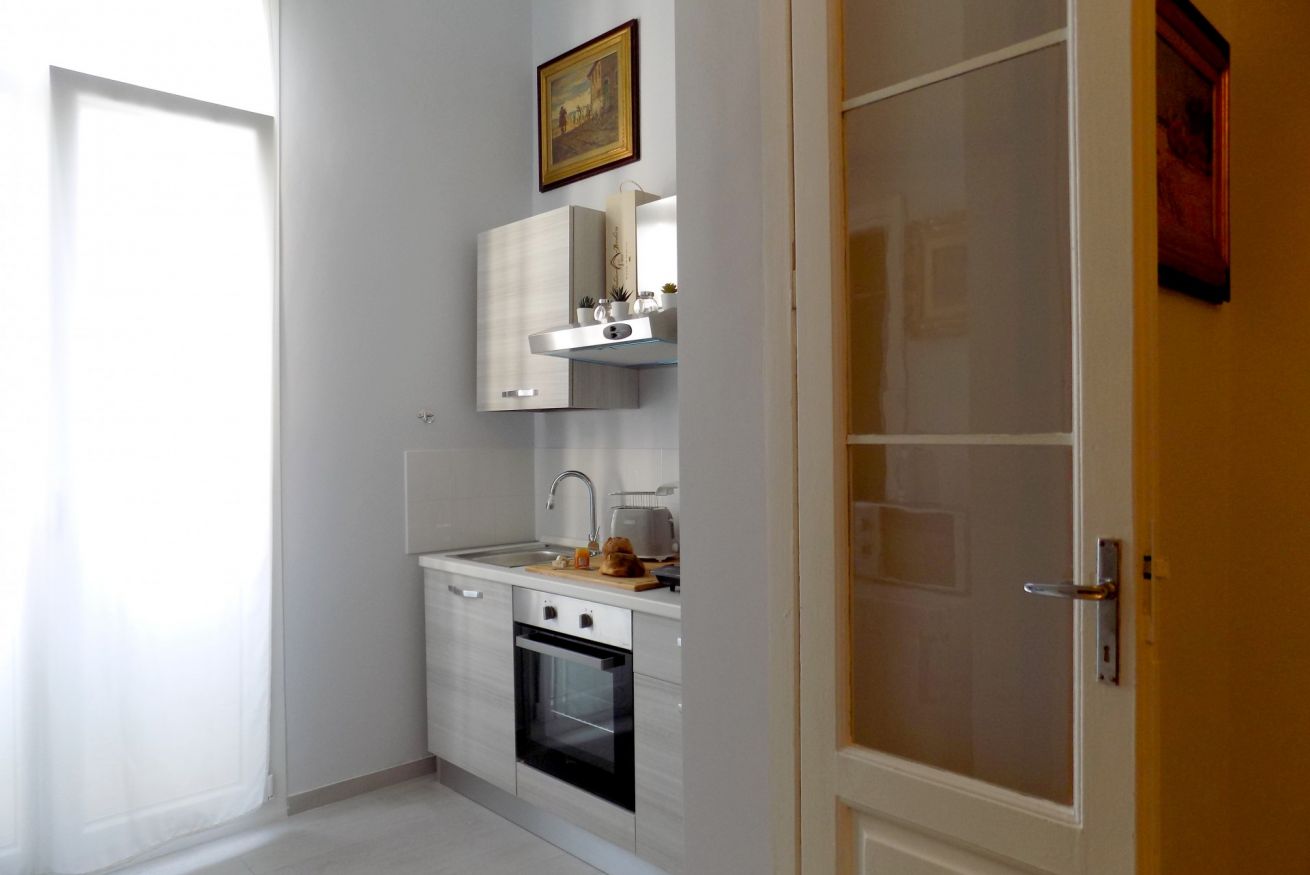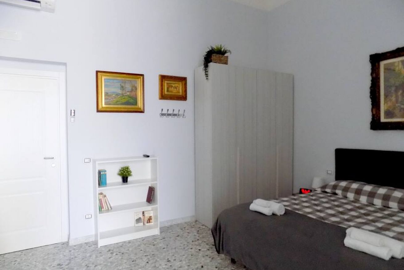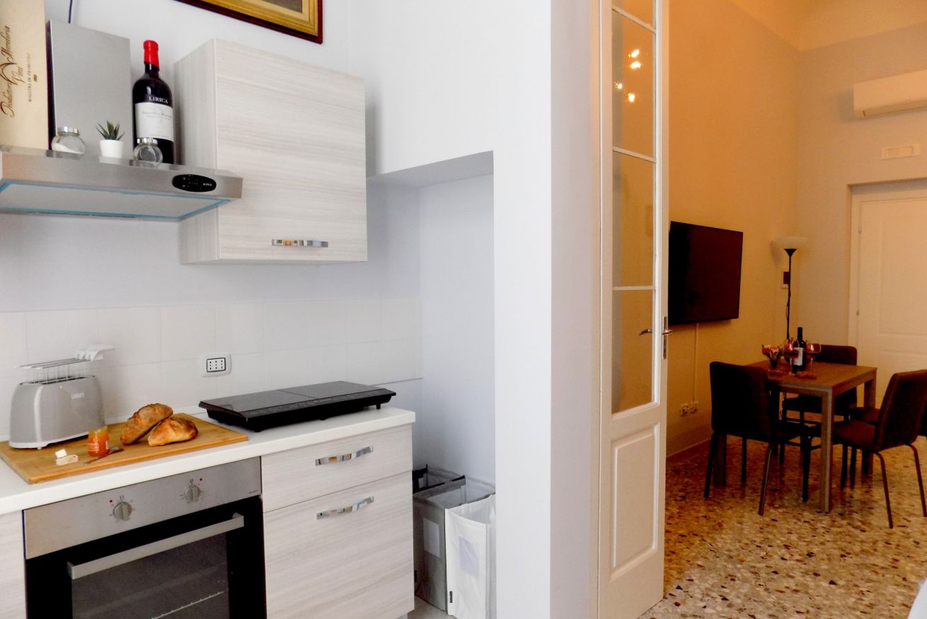 L’appartamento, di recente ristrutturazione, è al secondo piano di un antico palazzo dotato di ascensore. La porta di ingresso si apre su una stanza monitorata con telecamere a circuito chiuso da cui si accede a ciascuna unità abitativa. L’ampia metratura dell’appartamento permette di ospitare sino a 4 persone grazie alla presenza di un letto matrimoniale e all’occorrenza di altri 2 letti singoli. L'appartamento, dotato di climatizzatore caldo/freddo, Tv maxi schermo con abbonamento Netflix e si affaccia sul lato interno del condominio motivo per cui risulta molto silenzioso. La cucina è dotata fuochi elettrici, bollitore, tostapane, frigorifero e forno microonde. Il bagno è spazioso e dotato di sanitari sospesi e comodo box doccia.