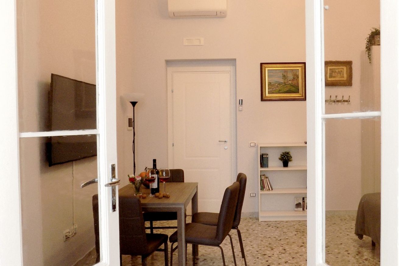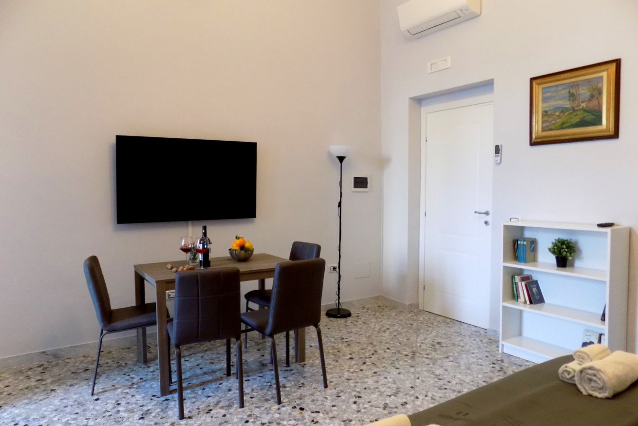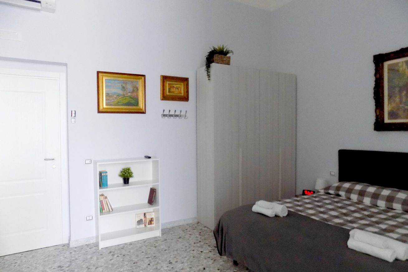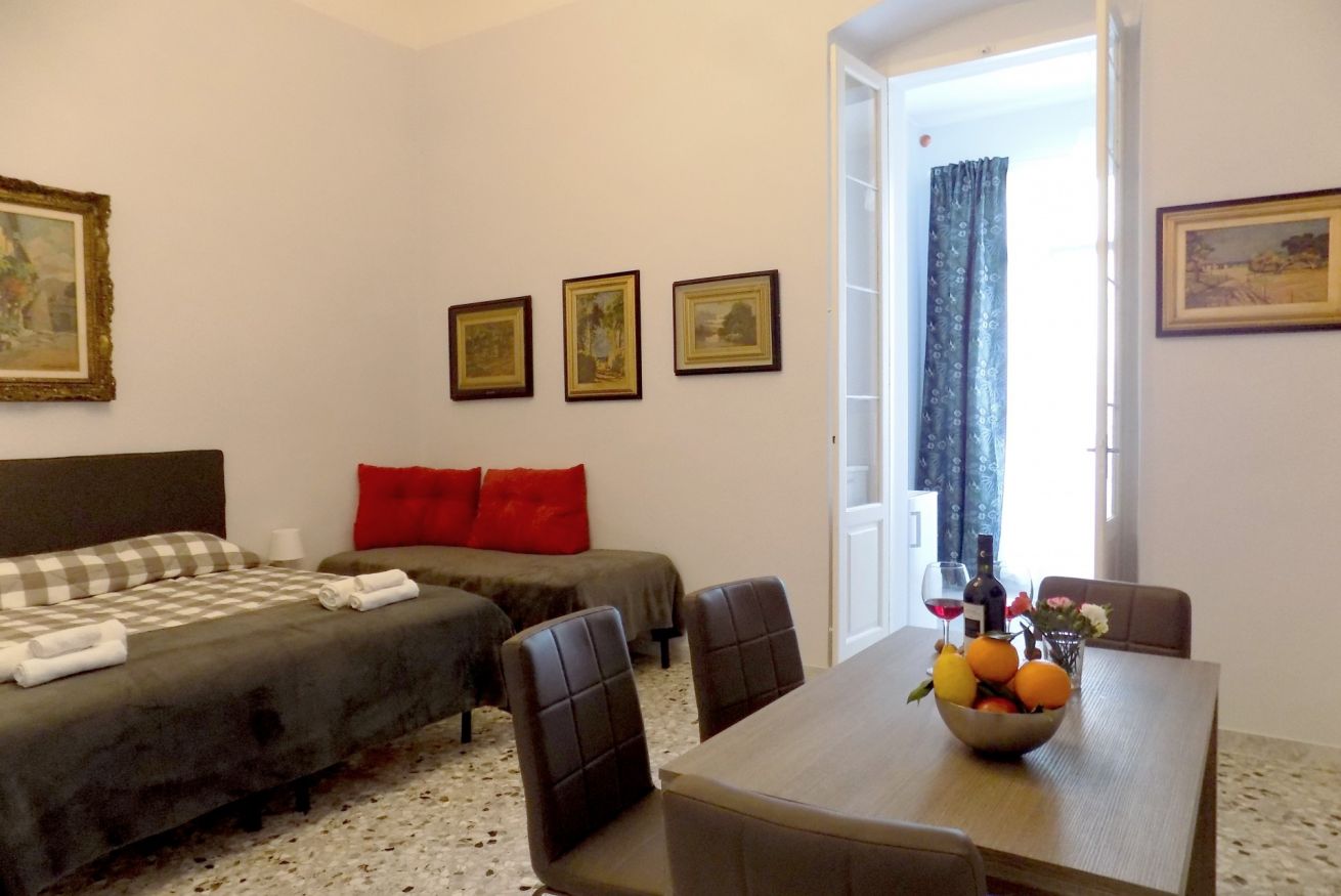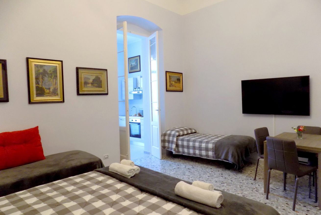 L’appartamento, di recente ristrutturazione, è al secondo piano di un antico palazzo dotato di ascensore. La porta di ingresso si apre su una stanza monitorata con telecamere a circuito chiuso da cui si accede a ciascuna unità abitativa. L’ampia metratura dell’appartamento permette di ospitare sino a 4 persone grazie alla presenza di un letto matrimoniale e all’occorrenza di altri 2 letti singoli. L'appartamento, dotato di climatizzatore caldo/freddo, Tv maxi schermo con abbonamento Netflix e si affaccia sul lato interno del condominio motivo per cui risulta molto silenzioso. La cucina è dotata fuochi elettrici, bollitore, tostapane, frigorifero e forno microonde. Il bagno è spazioso e dotato di sanitari sospesi e comodo box doccia.