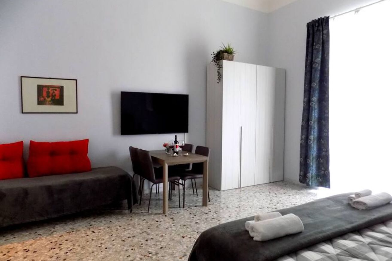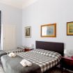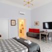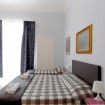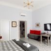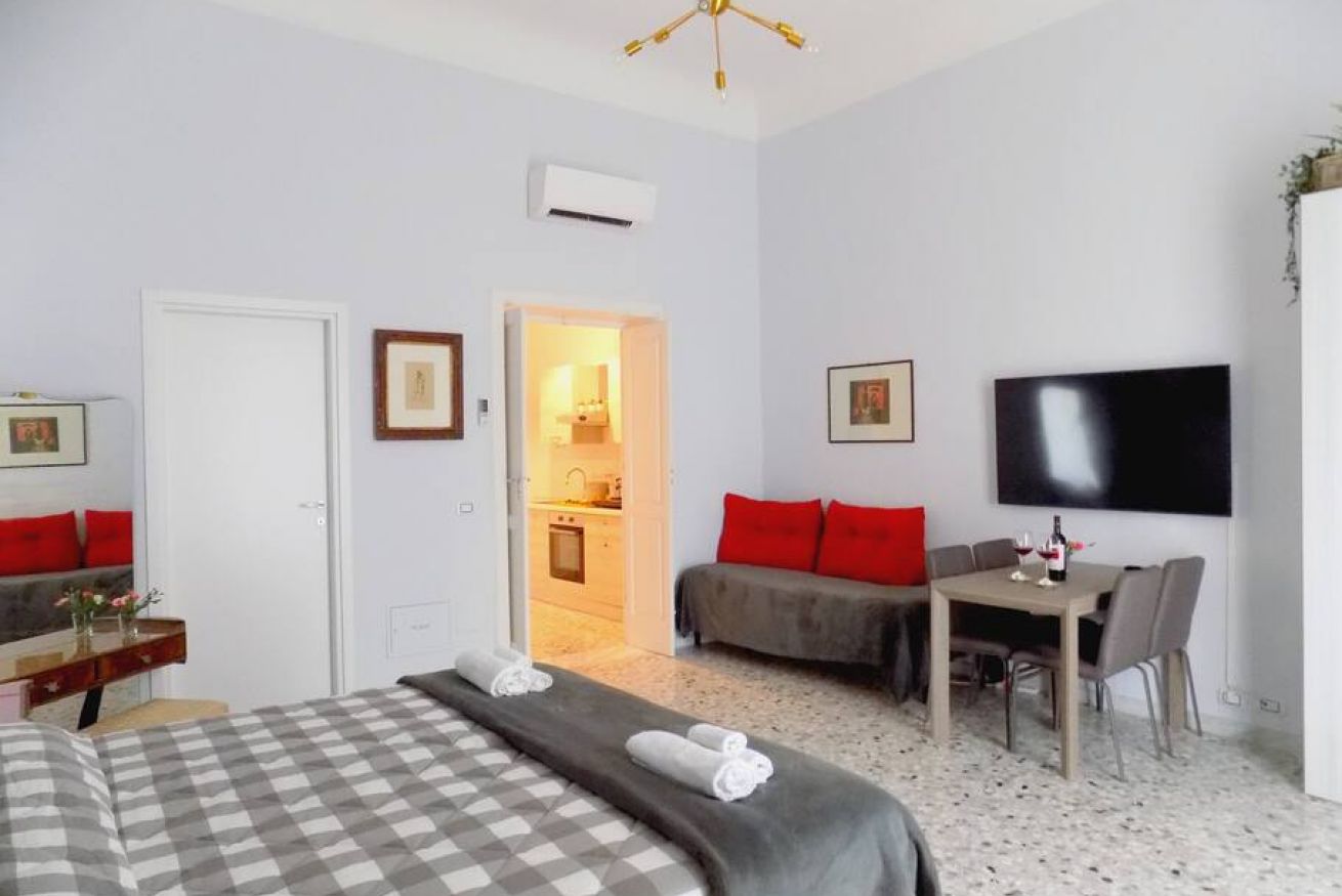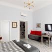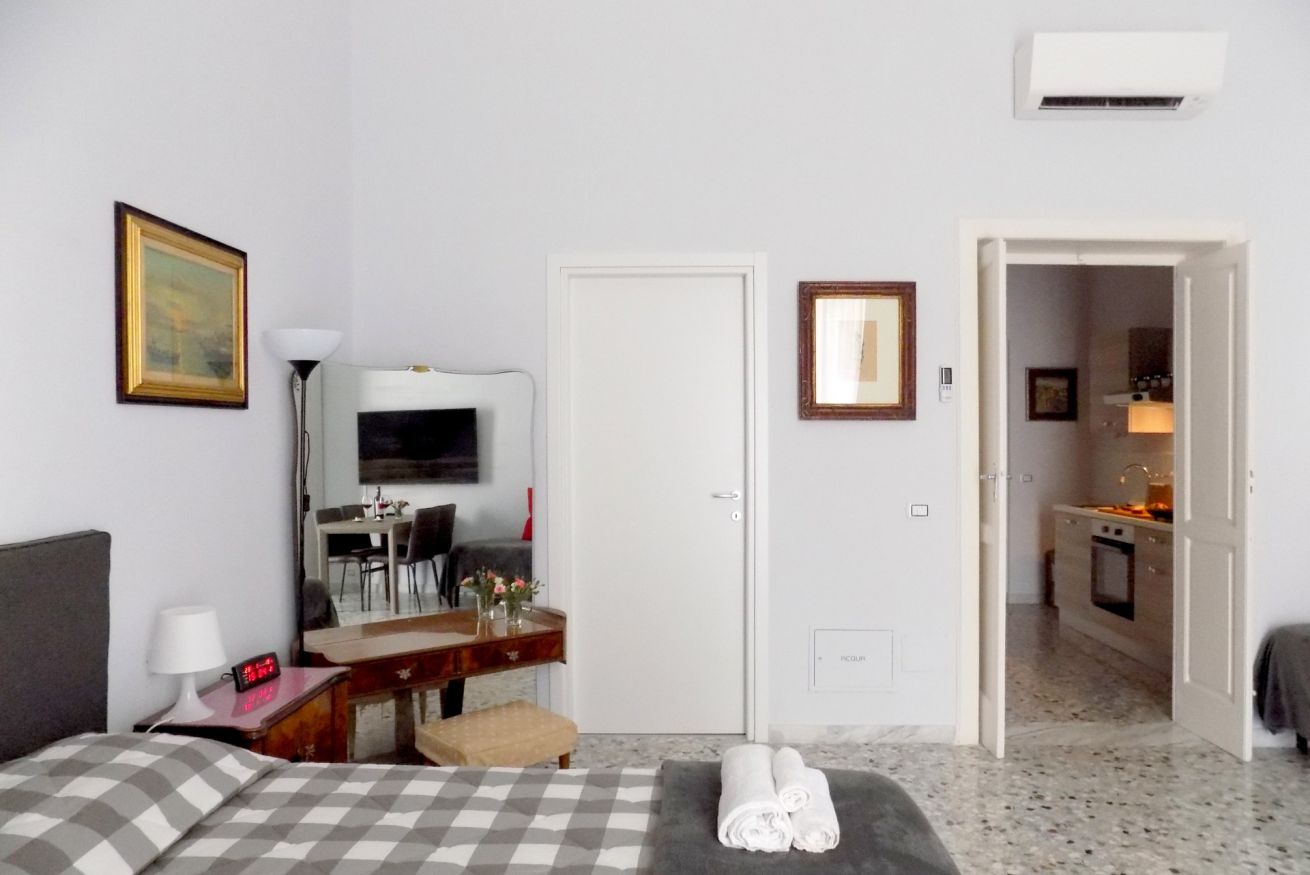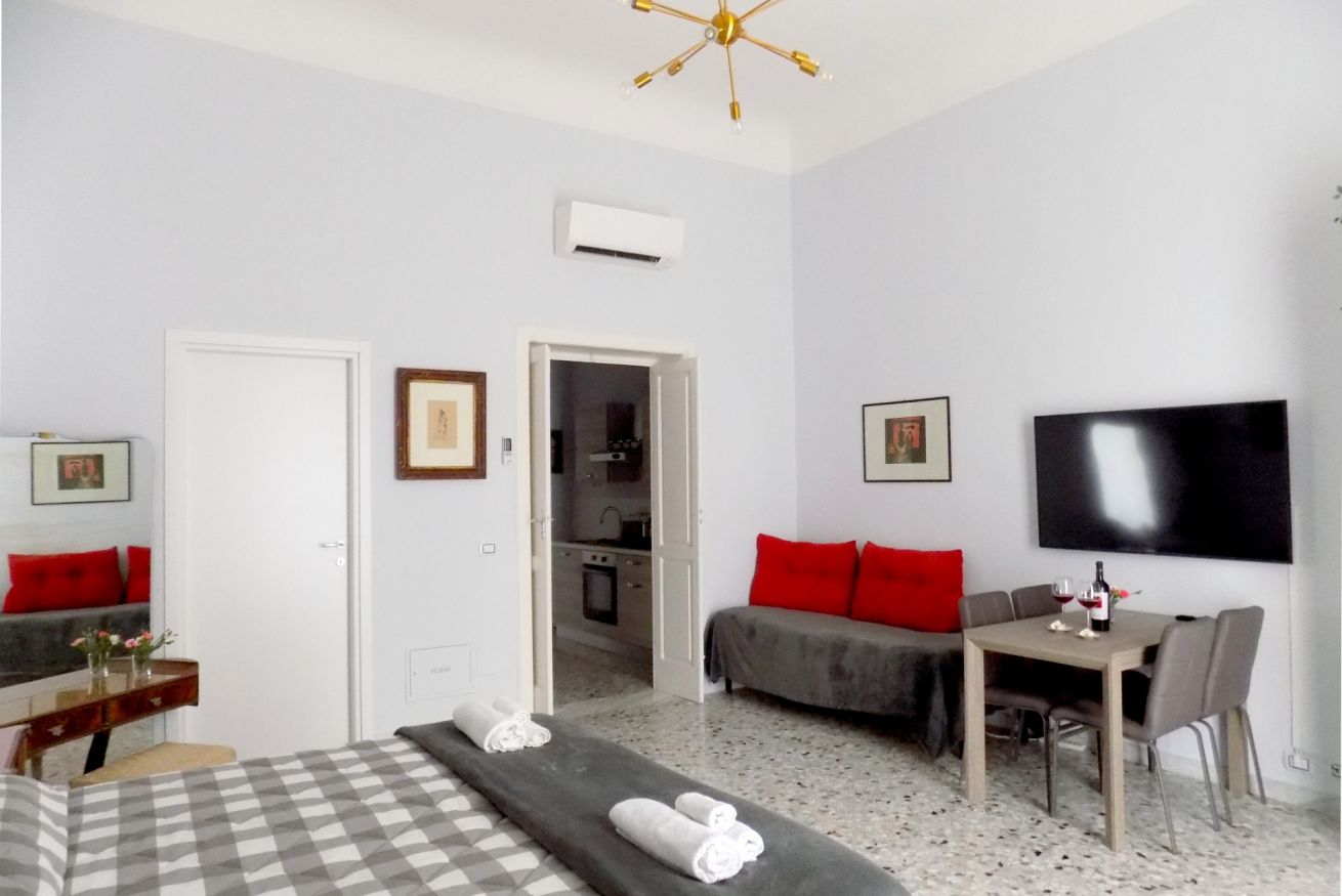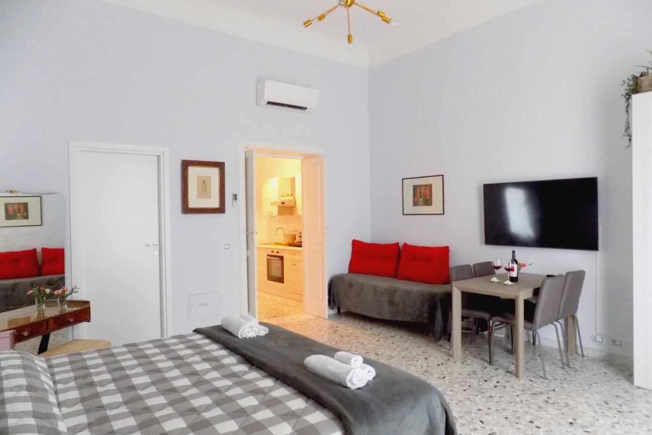 L’appartamento, di recente ristrutturazione, è al secondo piano di un antico palazzo dotato di ascensore. La porta di ingresso si apre su una stanza monitorata con telecamere a circuito chiuso da cui si accede a ciascuna unità abitativa. L’appartamento è composto da una cucina dotata di fuochi elettrici, bollitore, tostapane, frigorifero e forno microonde. L’affaccio molto piacevole sul giardino della piazza, dà la sensazione di trovarsi lontani dal traffico cittadino. Le volte alte e la finestra a tutt’altezza, rendono l’ambiente molto luminoso e l’ampia metratura della stanza permette di ospitare sino a 4 persone grazie alla presenza di un letto matrimoniale e all’occorrenza di altri 2 letti singoli. L’appartamento è dotato di un condizionatore caldo/freddo e un bagno spazioso con sanitari sospesi e comodo box doccia.