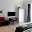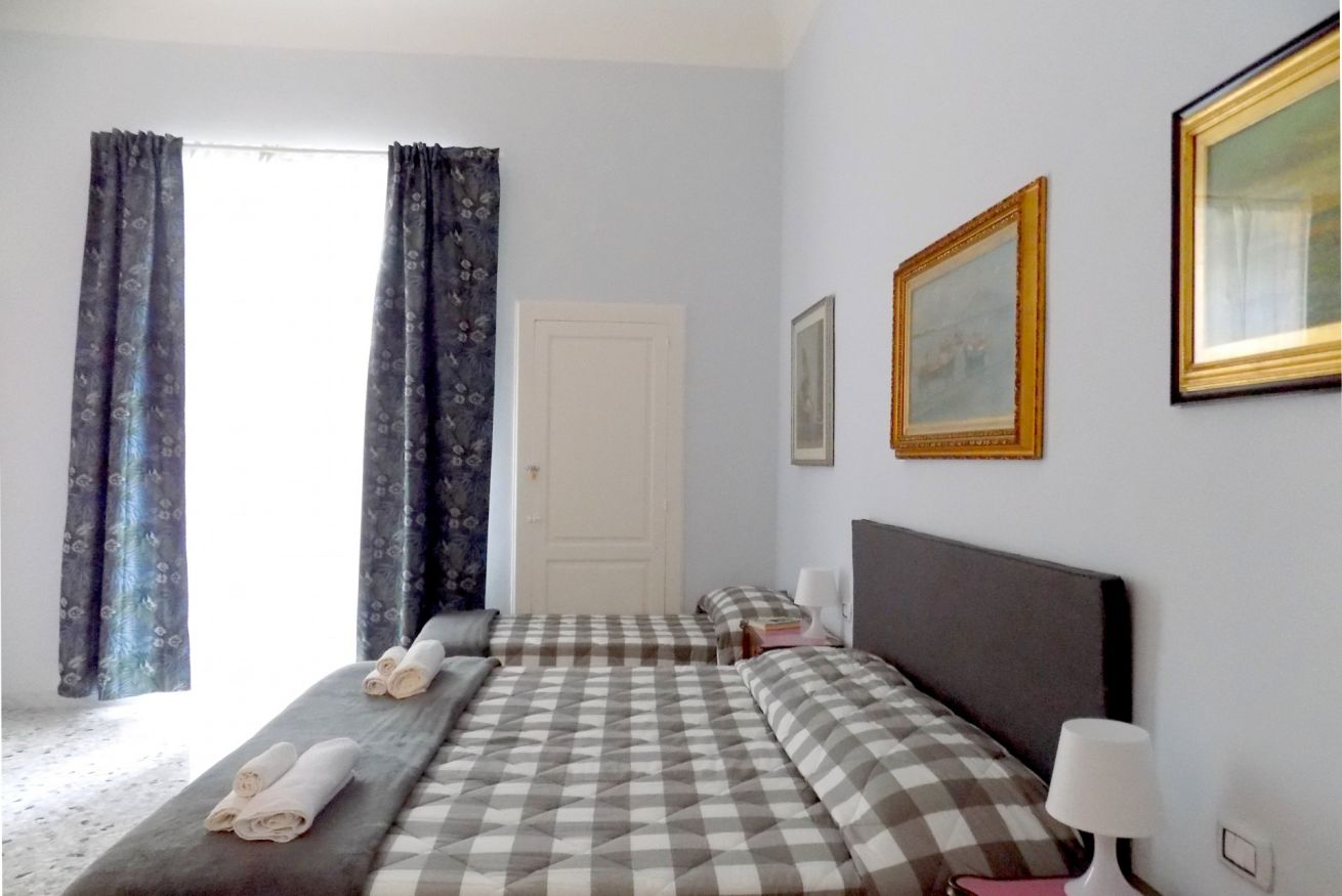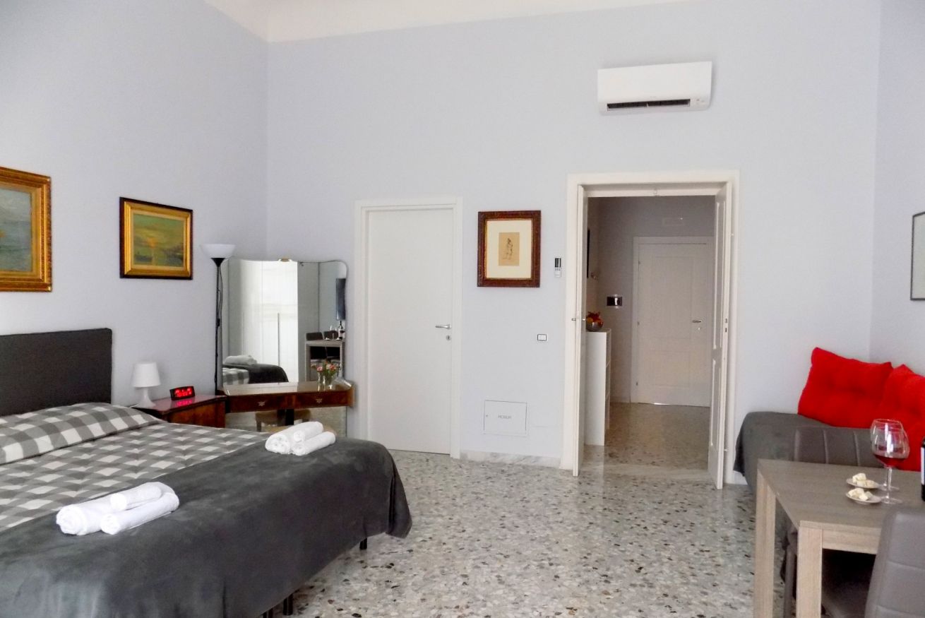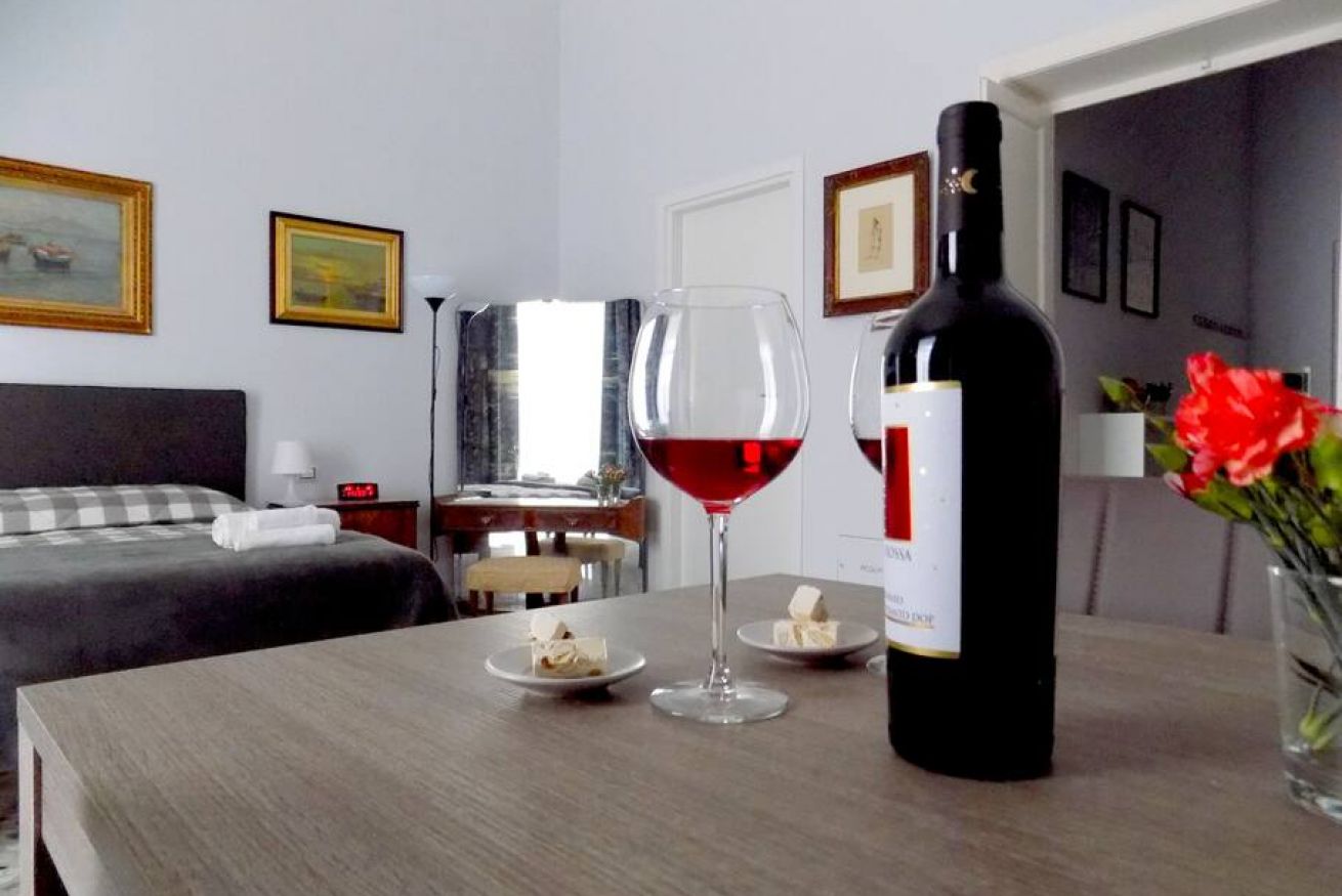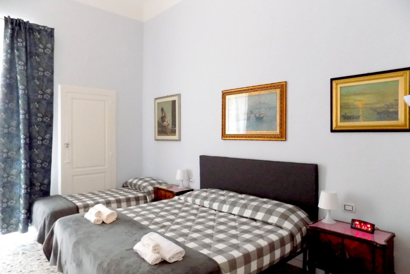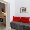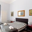 L’appartamento, di recente ristrutturazione, è al secondo piano di un antico palazzo dotato di ascensore. La porta di ingresso si apre su una stanza monitorata con telecamere a circuito chiuso da cui si accede a ciascuna unità abitativa. L’appartamento è composto da una cucina dotata di fuochi elettrici, bollitore, tostapane, frigorifero e forno microonde. L’affaccio molto piacevole sul giardino della piazza, dà la sensazione di trovarsi lontani dal traffico cittadino. Le volte alte e la finestra a tutt’altezza, rendono l’ambiente molto luminoso e l’ampia metratura della stanza permette di ospitare sino a 4 persone grazie alla presenza di un letto matrimoniale e all’occorrenza di altri 2 letti singoli. L’appartamento è dotato di un condizionatore caldo/freddo e un bagno spazioso con sanitari sospesi e comodo box doccia.