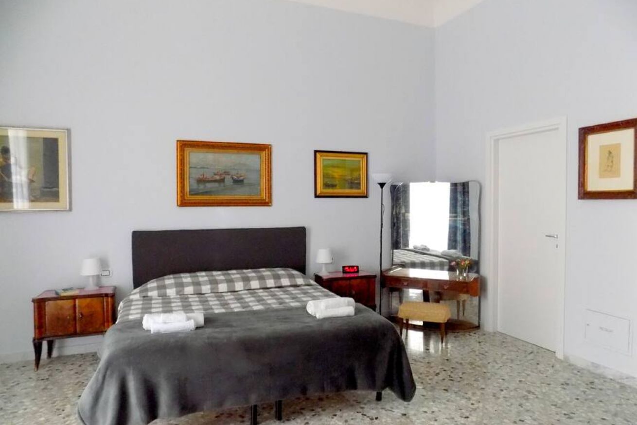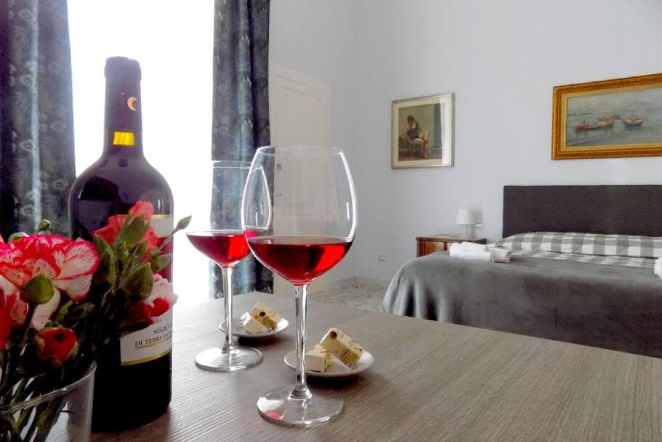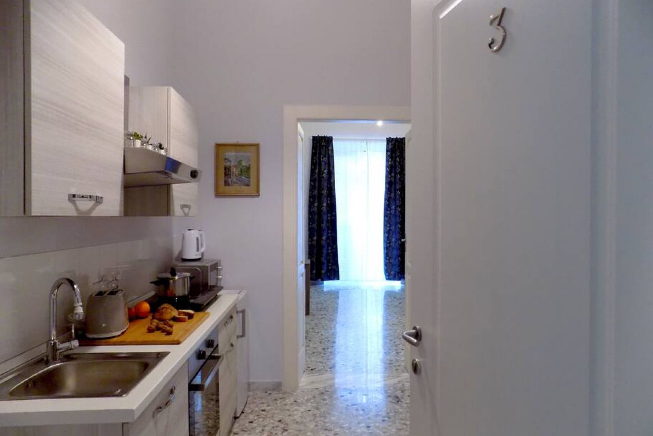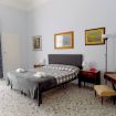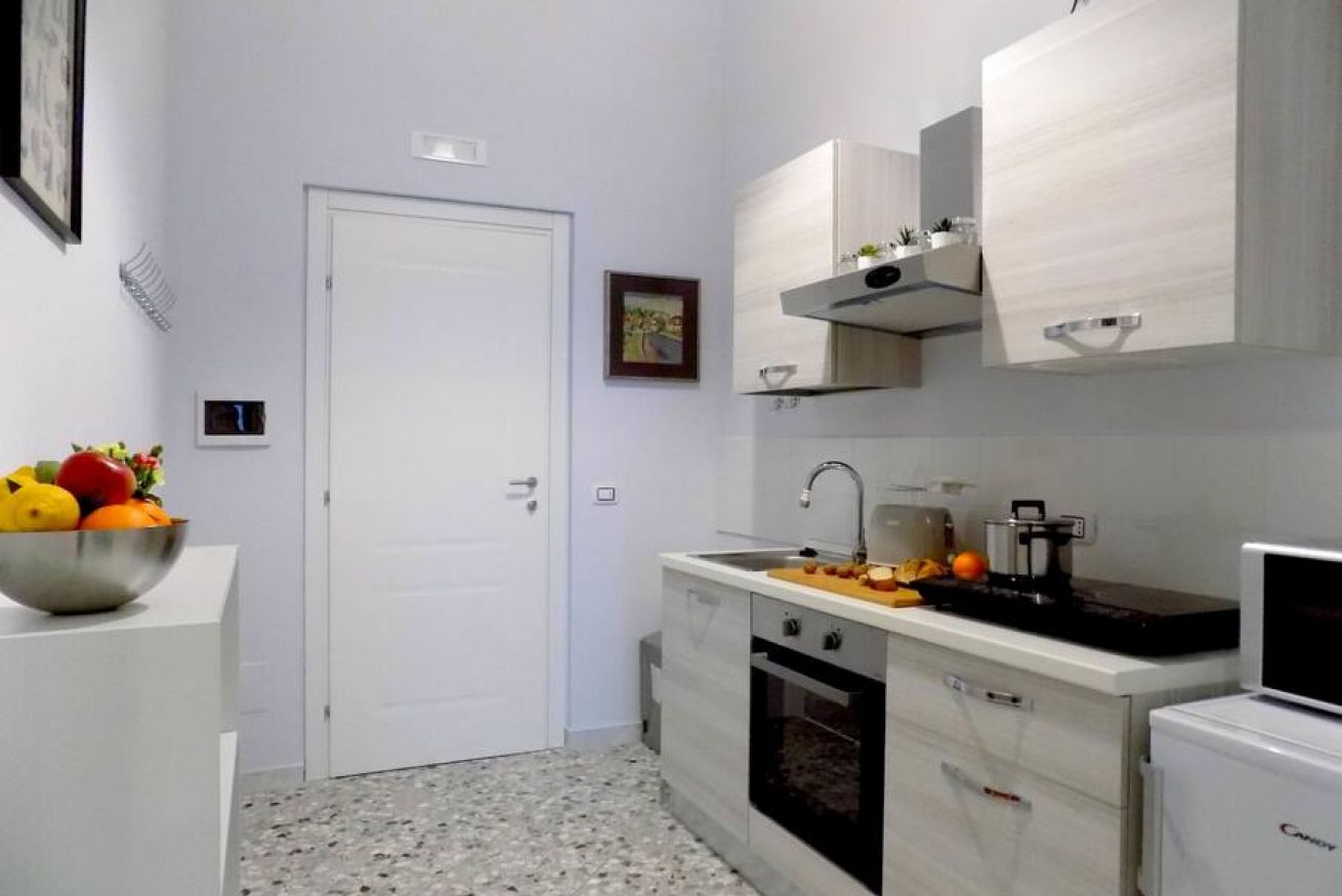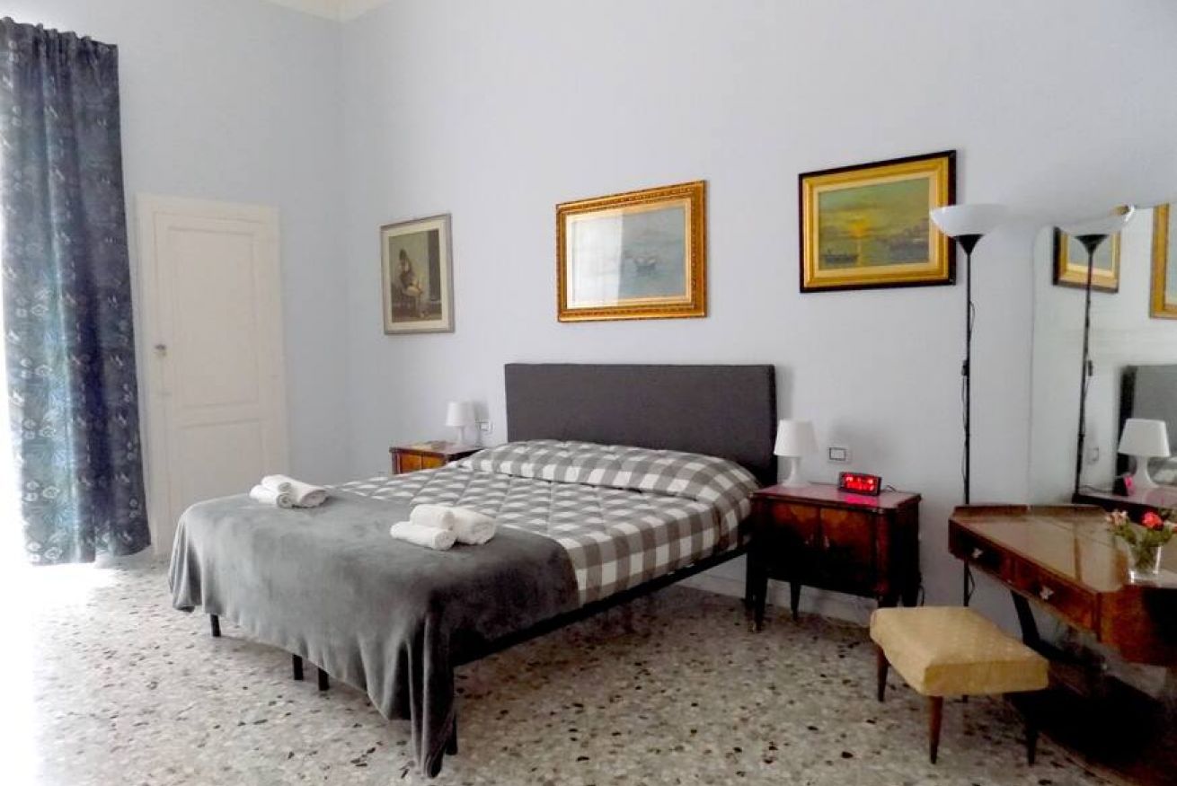 L’appartamento, di recente ristrutturazione, è al secondo piano di un antico palazzo dotato di ascensore. La porta di ingresso si apre su una stanza monitorata con telecamere a circuito chiuso da cui si accede a ciascuna unità abitativa. L’appartamento è composto da una cucina dotata di fuochi elettrici, bollitore, tostapane, frigorifero e forno microonde. L’affaccio molto piacevole sul giardino della piazza, dà la sensazione di trovarsi lontani dal traffico cittadino. Le volte alte e la finestra a tutt’altezza, rendono l’ambiente molto luminoso e l’ampia metratura della stanza permette di ospitare sino a 4 persone grazie alla presenza di un letto matrimoniale e all’occorrenza di altri 2 letti singoli. L’appartamento è dotato di un condizionatore caldo/freddo e un bagno spazioso con sanitari sospesi e comodo box doccia.