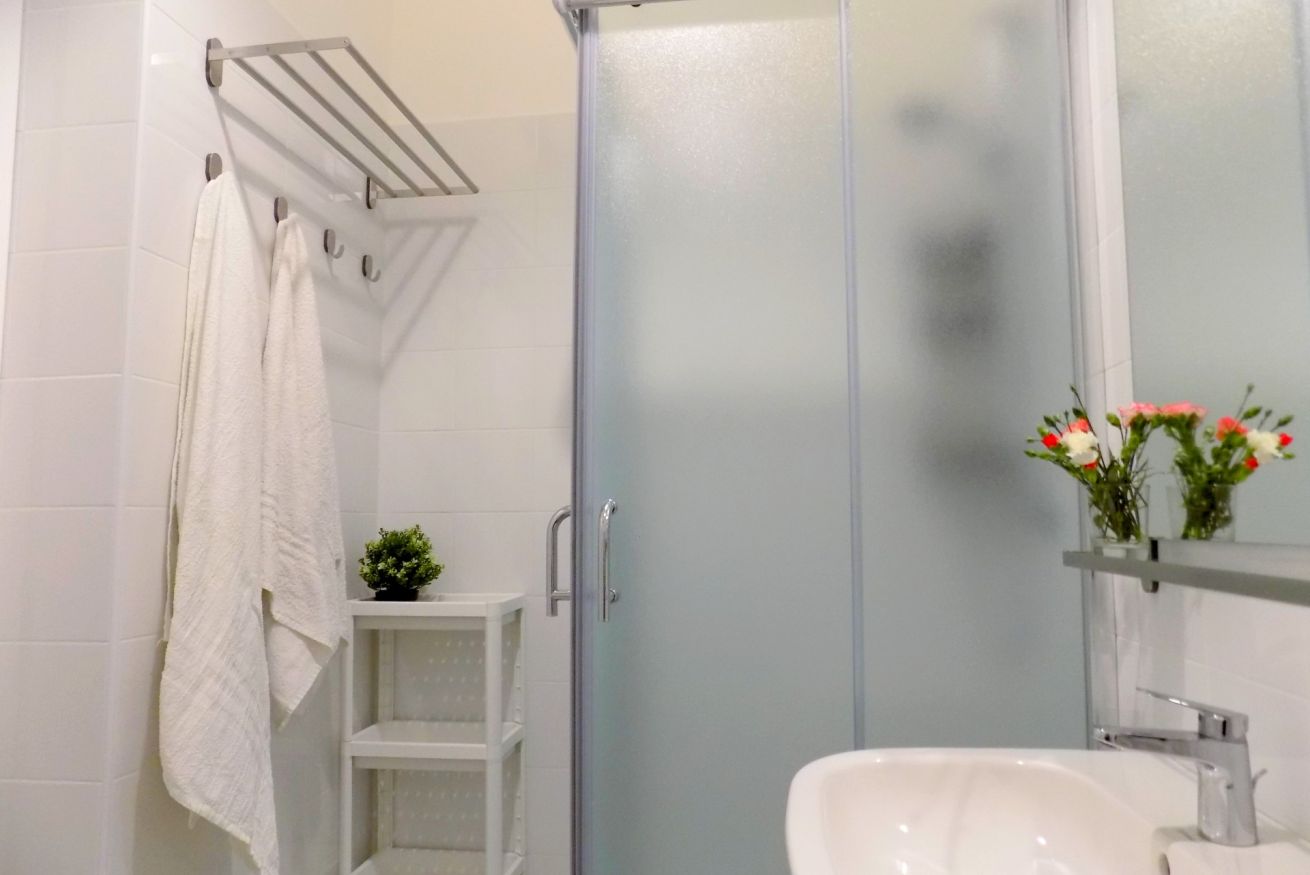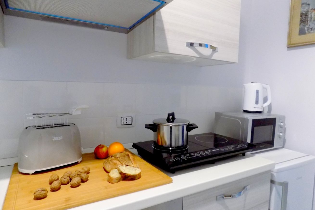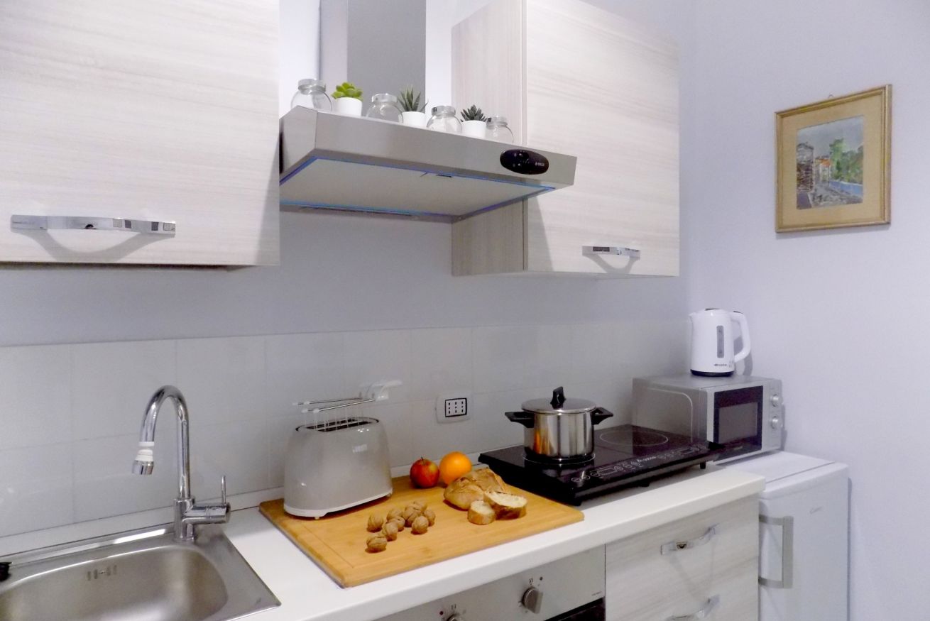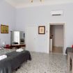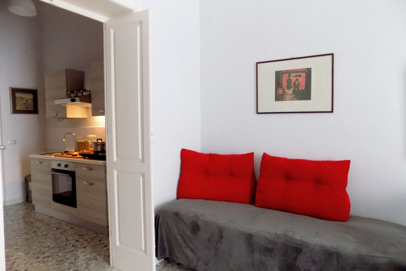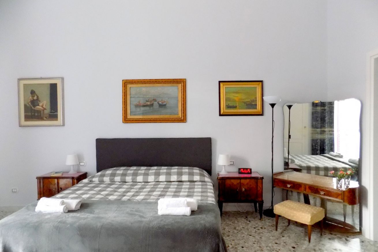L’appartamento, di recente ristrutturazione, è al secondo piano di un antico palazzo dotato di ascensore. La porta di ingresso si apre su una stanza monitorata con telecamere a circuito chiuso da cui si accede a ciascuna unità abitativa. L’appartamento è composto da una cucina dotata di fuochi elettrici, bollitore, tostapane, frigorifero e forno microonde. L’affaccio molto piacevole sul giardino della piazza, dà la sensazione di trovarsi lontani dal traffico cittadino. Le volte alte e la finestra a tutt’altezza, rendono l’ambiente molto luminoso e l’ampia metratura della stanza permette di ospitare sino a 4 persone grazie alla presenza di un letto matrimoniale e all’occorrenza di altri 2 letti singoli. L’appartamento è dotato di un condizionatore caldo/freddo e un bagno spazioso con sanitari sospesi e comodo box doccia.